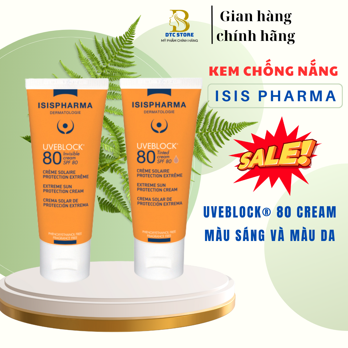 - Isis Pharma Uveblock 80 Tinted Cream SPF 50+ là dòng sản phẩm có chỉ số chống nắng SPF rất cao giúp bảo vệ bạn an toàn dưới ánh nắng gay gắt. Sản phẩm không gây rít, không gây nhờn phù hợp với nhiều loại da, nhất là làn da nhạy cảm khó tính. Có thể sử dụng sản phẩm như một lớp kem lót trước khi trang điểm.